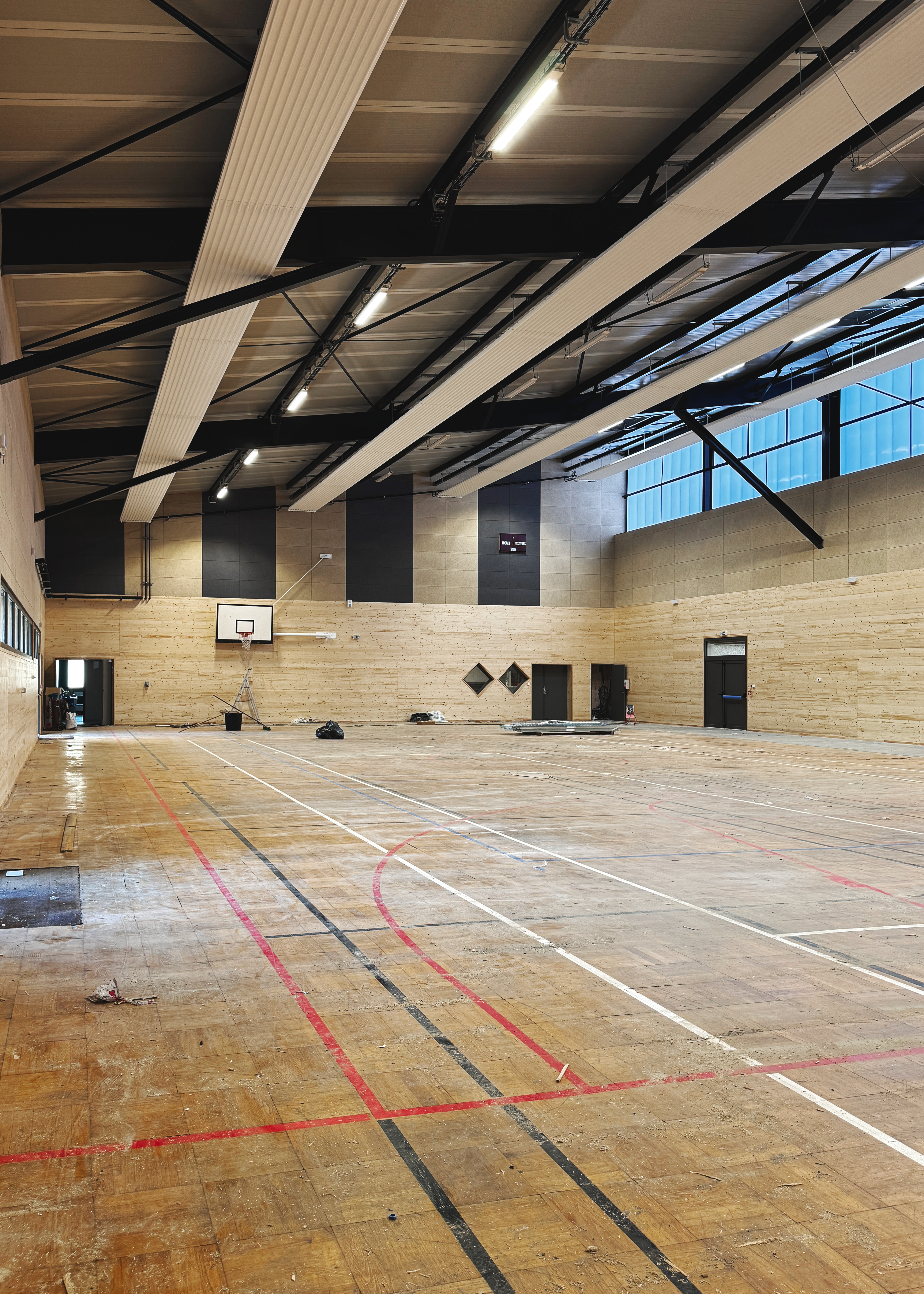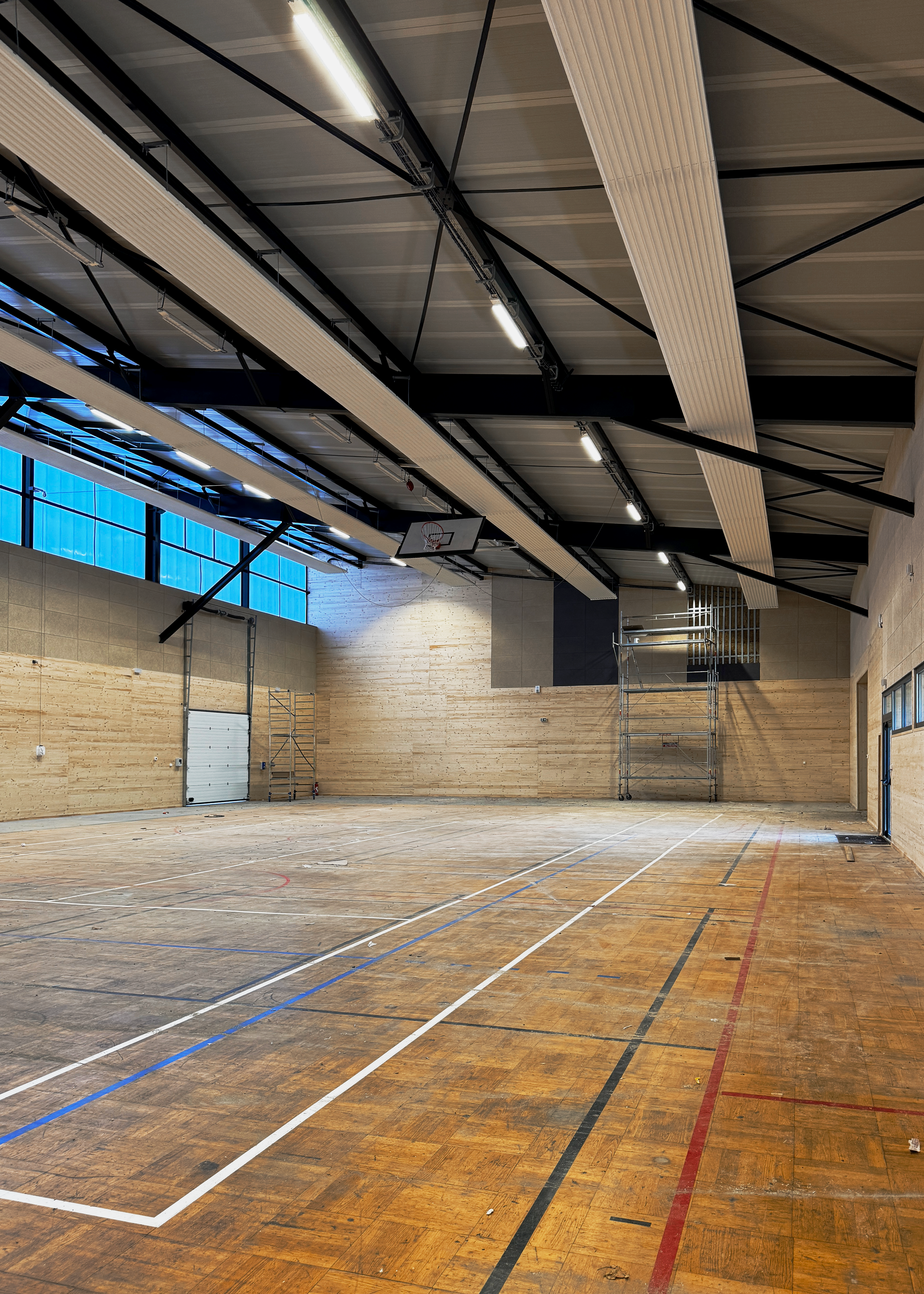 Les équipes poursuivent actuellement la pose du doublage en panneaux trois plis et fibres de bois, contribuant à la performance acoustique et au confort de l’espace, ainsi que le peinture des lignes de démarcation et le traitement du plancher.